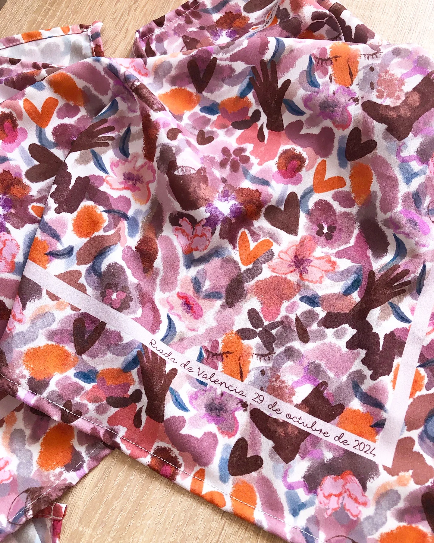 Posiblemente éste sea el único estampado en el mundo dedicado y creado por y para la riada de Valencia, y estimé valioso inmmortalizarlo en un complemento exclusivo, siendo un modo de hacerlo formar parte de nuestro día a día, y de continuar siendo motivo de ayuda para los afectados, a través de los porcentajes donados para la causa.